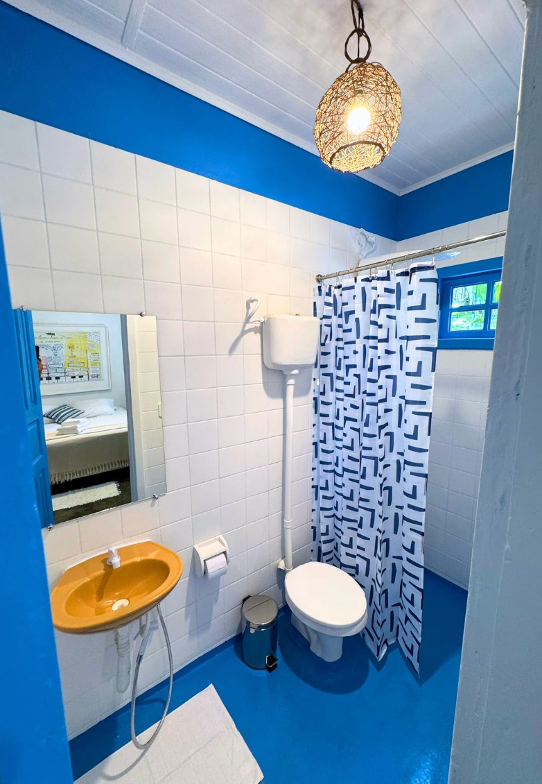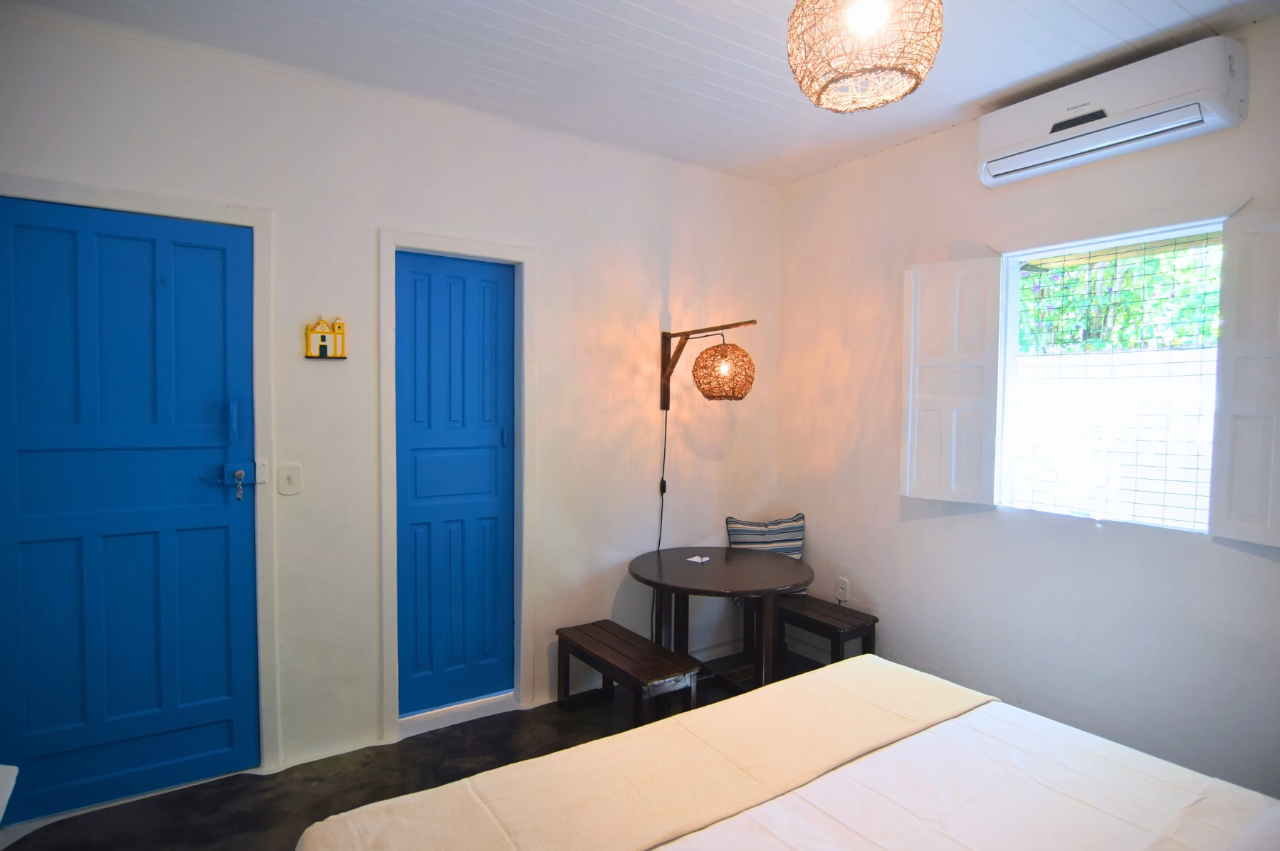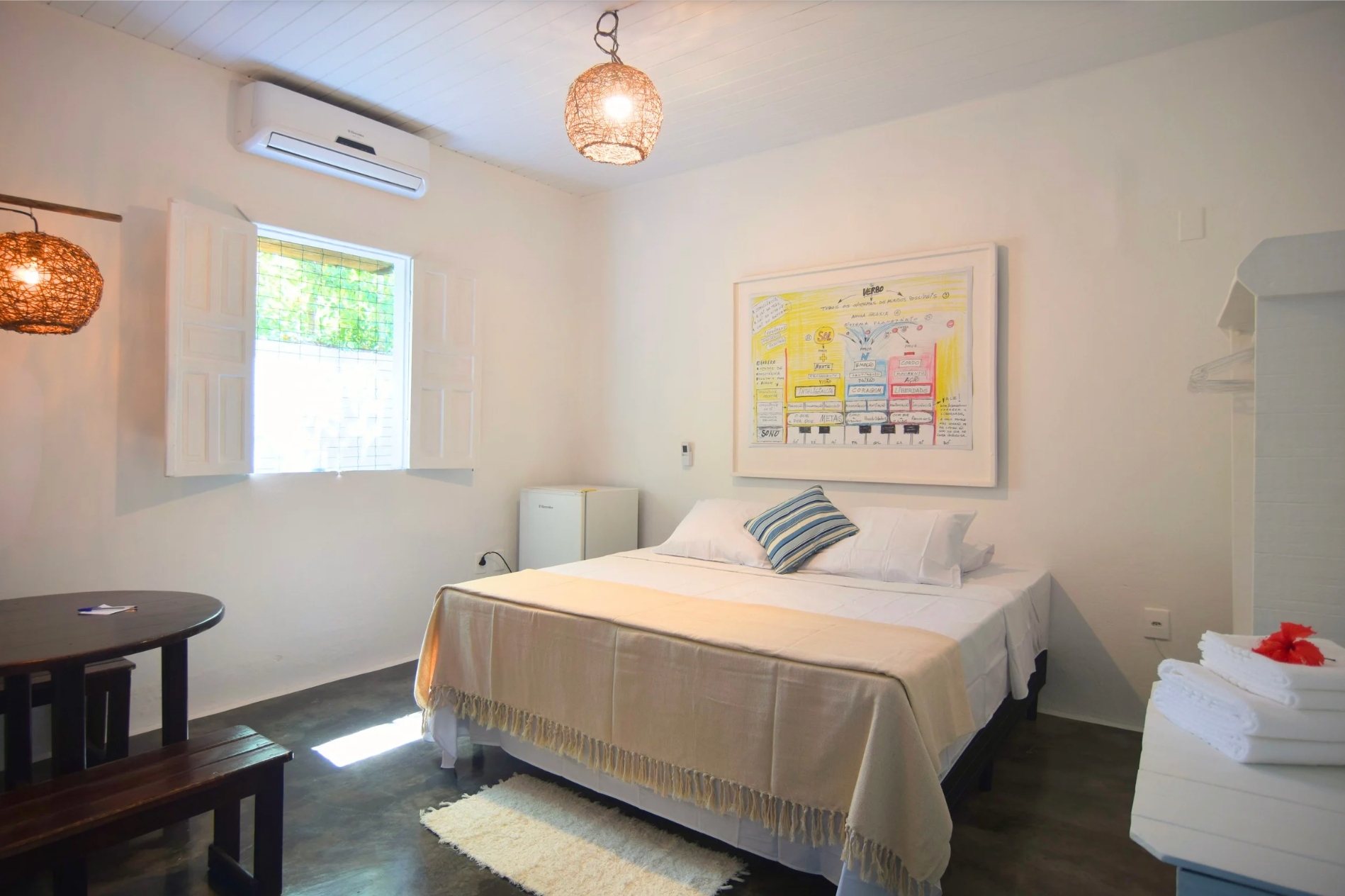 Ar condicionado, frigobar, toalhas e lençóis de algodão, cama box queen, mesa
