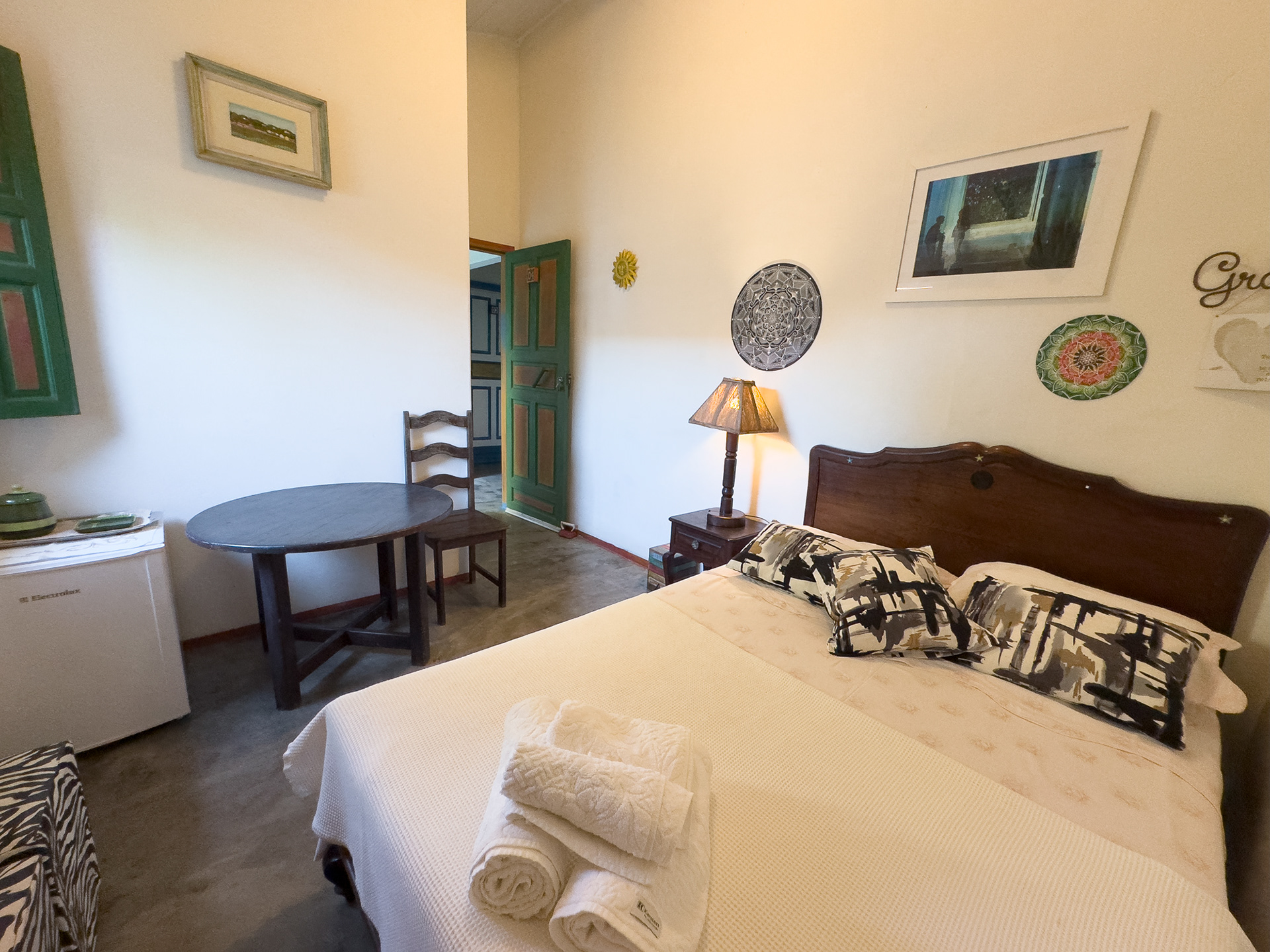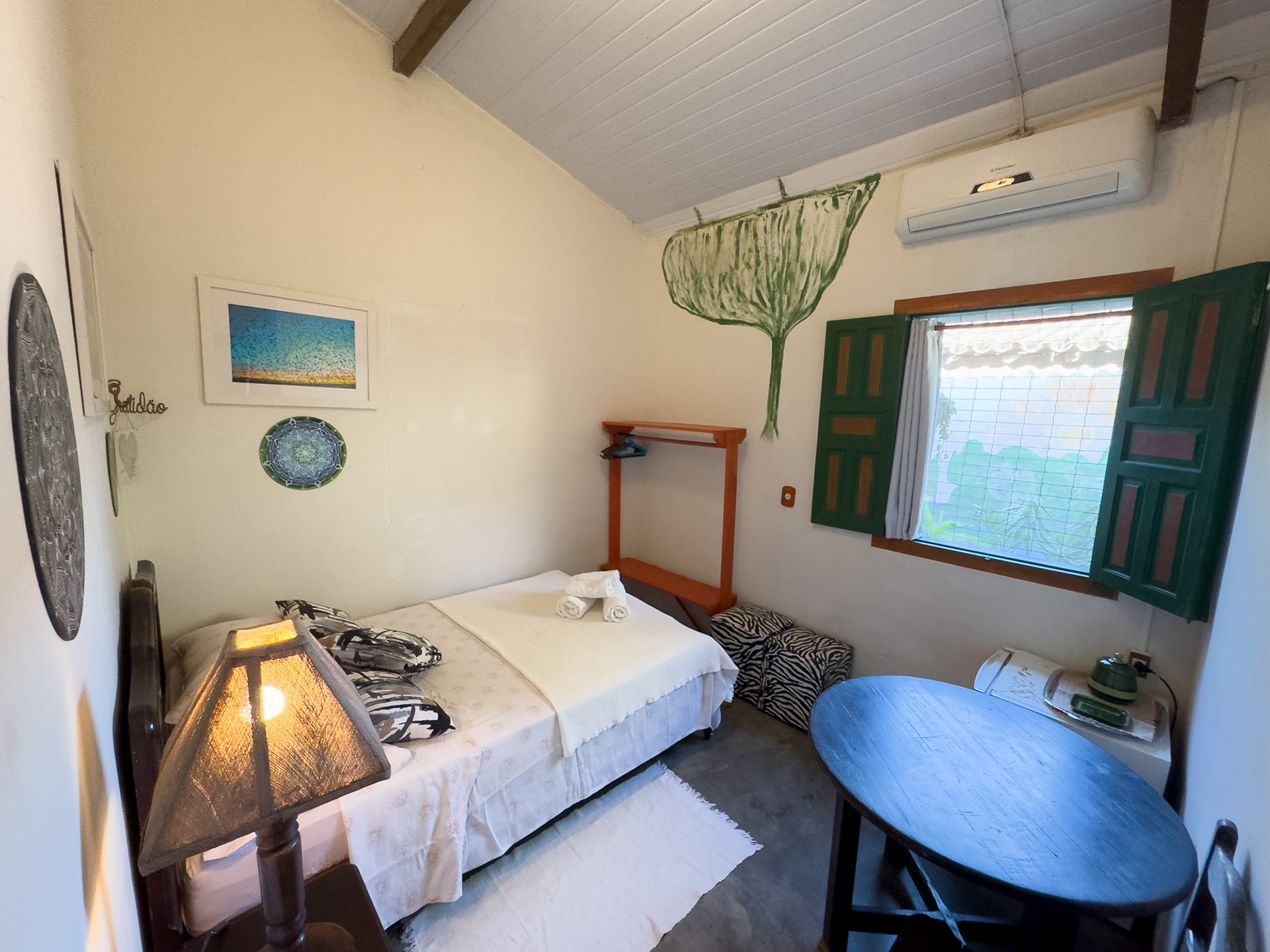 Ar condicionado, frigobar, toalhas e lençóis de algodão, cama de casal